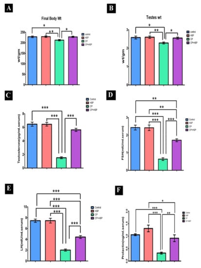The serum levels of testosterone, FSH, LH, and prolactin showed a significant decrease in the CP-treated group in comparison to the control group (p < 0.05) in Figure 1C–F. The serum levels of testosterone, FSH, LH, and prolactin in the CP+HSP-treated group showed a significant increase compared to the CP-treated group, shown in Figure 1C–F.