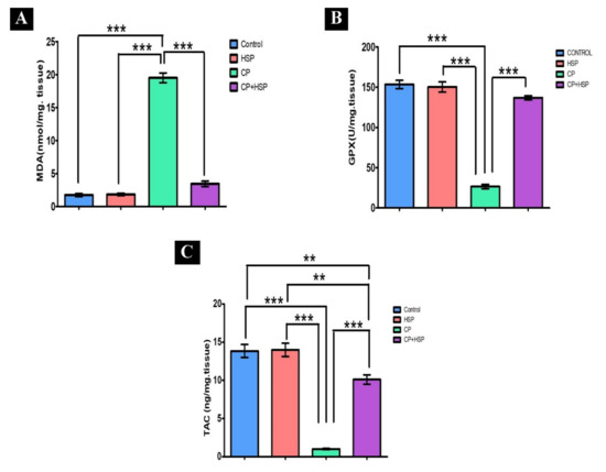 CP-induced oxidative stress was indicated, with a significant decrease in GPx and TAC levels in the CP-treated group in comparison to that in the control group (p < 0.05), shown in Figure 2B,C. A significant increase in the MDA level, the lipid peroxidation marker, in the CP-treated group in comparison to that in the control group (p < 0.05) is also shown in Figure 2A. The CP+HSP-treated rats showed a significant decrease in testicular MDA levels, as well as a significant increase in testicular GPx and TAC levels, in comparison to those in the CP-treated group, shown in Figure 2A–C.