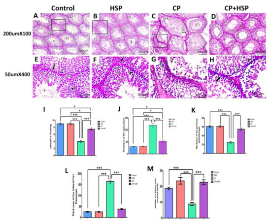 In the present study, the number of Leydig cells in the CP+HSP-treated group increased significantly when compared to the CP-treated group [77]. HSP treatment with cisplatin causes considerable improvement in the thickness of germinal epithelium [67]. Quercetin co-treatment showed a significant reduction in the interstitial space in the arsenic-treated group [78]. Melatonin co-treatment showed a significant reduction in the thickness of tunica albuginea in the taxol-treated group [79].