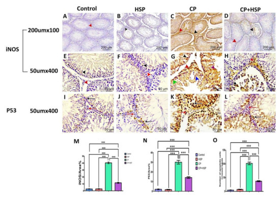 The CP-treated group revealed a significant increase in iNOS, only formed during inflammation, ischemia, and apoptosis [51], immune reactivity in the cytoplasm of the cells of the seminiferous tubules [52]. Exposure to cisplatin, aluminum chloride, methotrexate, and silica nanoparticles reported an increase in testicular iNOS expression [53,54,55,56]. Anticancer drugs, including cyclophosphamide, methotrexate, tamoxifen, doxorubicin, and 5-fluorouracil administration, have been associated with the induction of oxidative stress and inflammation [57]. Such results, confirmed by another flavonoid (quercetin), [54] found that coadministration of quercetin to the aluminum chloride-treated group decreased the iNOS expression in testis tissue. HSP caused a marked decrease in the CP-induced expression of iNOS in the liver [58] and renal tissue [59]. Coadministration of another antioxidant as melatonin decreased the expression of iNOS in testicular tissue in the cisplatin-treated group [60].