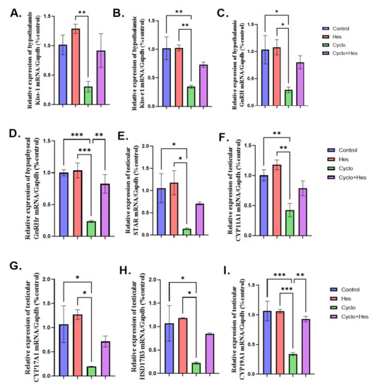 Effect of hesperidin administration in cyclophosphamide-induced testicular impairment in male rats on mRNA expression of hypothalamic KISS-1, KISS-1r, GnRH, hypophyseal GnRHr and testicular steroidogenic enzymes (A–I). (A) Hypothalamic KISS-1/Gapdh (% control), (B) mRNA expression of hypothalamic KISS-1r/Gapdh (% control), (C) mRNA expression of hypothalamic GnRH/Gapdh (% control), (D) mRNA expression of hypophyseal GnRHr/Gapdh (% control), (E) Testicular Star/Gapdh (% control), (F) Testicular Cyp11a1/Gapdh (% control), (G) Testicular Cyp17A1/Gapdh (% control), (H) Testicular HSD17B3/Gapdh (% control), and (I) Testicular Cyp19A1/Gapdh (% control). Data are expressed as means ± SEM. *, **, *** indicate significant difference (p < 0.05).