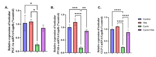 Effect of hesperidin administration in cyclophosphamide-induced testicular impairment in male rats on mRNA expression of testicular GLP-1, PGC-1, and PPAR-a (A–C). (A) Testicular PGC-1/Gapdh (% control), (B) mRNA expression of testicular PPAR-a/Gapdh (% control), and (C) mRNA expression of testicular GLP-1/Gapdh (% control). Data are expressed as means ± SEM. *, **, ***, **** indicate significant difference (p < 0.05).