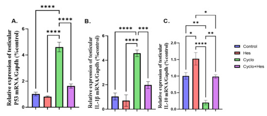 Effect of hesperidin administration in cyclophosphamide-induced testicular impairment in male rats on mRNA expression of testicular P53, IL1B, and IL10 (A–C). (A) Testicular P53/Gapdh (% control), (B) mRNA expression of testicular IL1B/Gapdh (% control), and (C) mRNA expression of testicular IL10/Gapdh (% control). Data are expressed as means ± SEM. *, **, ***, **** indicate significant difference (p < 0.05).