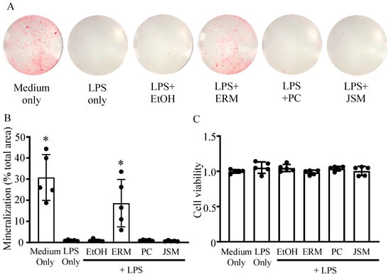 First, we examined the effect of ERM on osteogenesis in vitro by culturing MC-3T3 cells in osteoblast differentiation medium containing P. gingivalis LPS. MC-3T3 cells have been cloned as osteoprogenitor murine cell lines and are used in several osteoblast differentiation and characterization experiments [30,31]. Furthermore, the properties of the mineral and matrix phases of MC3T3-E1 osteoblast cultures have been reported to be highly similar to those of mouse bones in terms of mineral structure and composition [32]. After MC3T3 cells were cultured with P. gingivalis LPS (100 ng/mL) for 15 days, Alizarin Red staining was performed to measure the amount of mineralized nodule formation. The amount of mineral nodule formation was substantially decreased in all P. gingivalis LPS-supplemented groups except the ERM (10 μg/mL) treatment group. In the LPS + ERM treatment group, nodule formation was restored to a level similar to that in the control group (Figure 1A,B). P. gingivalis LPS and the antibiotics did not affect the viability of MC-3T3 cells at the concentrations tested, as shown in the MTT assay (Figure 1C).