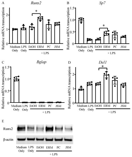 We measured the mRNA expression levels of osteoblast differentiation-related factors and Del-1 on day 12 of culture. The mRNA expression levels of Sp7 and Bglap were decreased in all LPS (100 ng/mL) groups compared to those in the control group (Figure 2B,C). In addition, Runx2 and Sp7 were markedly upregulated in the LPS + ERM (10 μg/mL) group compared to the EtOH + LPS group (Figure 2A,B). Notably, Del1 was also strongly upregulated in the LPS + ERM group (Figure 2D). Furthermore, when the protein expression of RUNX2 in each group was analyzed by western blotting, it was found to be markedly decreased in the LPS-supplemented group, except in the LPS + ERM group (Figure 2E). These results suggest that P. gingivalis LPS severely suppressed the expression of factors essential for osteoblast differentiation and that ERM might attenuate this effect and restore osteoblast differentiation activity.