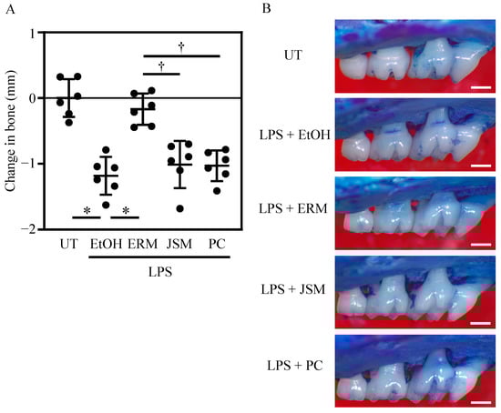 Peritoneal injection of antibiotics inhibits bone resorption in Porphyromonas gingivalis LPS-induced periodontitis. Periodontal bone loss was induced by the administration of P. gingivalis LPS to maxillary molars. The untreated (UT) group was set as a baseline control. The groups of mice were administered intraperitoneally 20% ethanol (EtOH; control), erythromycin (ERM), josamycin (JSM), or penicillin (PC). (A) The distance from the cement–enamel junction to the pinnacle of the alveolar bone was measured. Negative values (in mm) indicate bone loss relative to the UT control. (B) Representative images of the mouse maxillary bone from the indicated groups (scale bar of 0.5 mm). * p < 0.05 compared to the EtOH group; † p < 0.05 compared to the ERM group; values are shown as the mean ± SD (n = 5 per group).