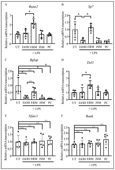 Runx2, Sp7 (osterix), and Bglap are typically expressed as osteogenic markers in the early, middle, and late stages of osteoblast differentiation. Several studies have reported that LPS inhibits osteoblast differentiation via gene regulation [27,36,37]. Therefore, we measured gene expression levels in the palatal gingiva of mouse molars via qPCR. We found that Sp7 and Bglap were substantially downregulated in all the P. gingivalis LPS-supplemented (500 μg/kg/d) groups except the ERM (100 mg/kg/d) treatment group. In contrast, the expression levels of Runx2 and Del1 were unaffected by the addition of P. gingivalis LPS. Furthermore, ERM treatment markedly upregulated Runx2 and Del1 compared to the levels measured in the EtOH group (Figure 4A–D). Therefore, ERM may facilitate the recovery from the downregulation of Sp7 and Bglap induced by P. gingivalis LPS. In addition, osteoclast differentiation-related factors, which are crucial for bone resorption in periodontitis, were also analyzed. The results showed no significant differences in Nfatc1 and RANK mRNA transcription between the groups (Figure 4E,F). These results of samples collected 2 weeks after LPS injection are consistent with the fact that in the periodontitis model with LPS administration, the strongest bone loss occurred within the first week of administration, followed by a further loss within one to two weeks, whereas there was little difference in bone levels between two and three weeks (Figure S1).