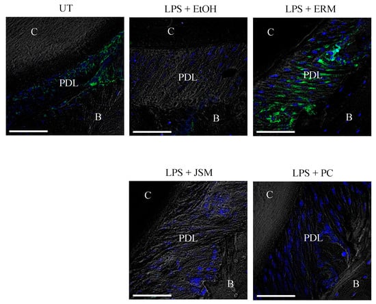 Based on the aforementioned in vitro results, we analyzed the effect of ERM on P. gingivalis LPS-induced inflammatory alveolar bone resorption in vivo. To measure the immunomodulatory effects of antimicrobial agents, a mouse periodontitis model using P. gingivalis LPS was established. Several studies have reported the induction of alveolar bone resorption via local administration of P. gingivalis LPS to the gingiva of mice [33,34,35]. In the present study, considerable alveolar bone resorption was similarly induced via administration of P. gingivalis LPS (500 μg/kg/d). Analysis of the suppression of alveolar bone resorption in the antimicrobial treatment group showed that alveolar bone resorption was potently suppressed in the ERM (100 mg/kg/d) treatment group alone. The PC (10,000 unit/kg/d) and JSM (100 mg/kg/d) treatments did not suppress alveolar bone resorption (Figure 3A,B).