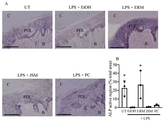 Erythromycin increases the alkaline phosphatase activity of cells in periodontal ligament tissue. Alkaline phosphatase staining was performed on frozen maxillary sections. (A) Representative images obtained by optical microscopy are shown. C: cementum; PDL: periodontal ligament; B: alveolar bone. Scale bars, 100 µm. (B) The total active region of alkaline phosphatase in each field was quantified and expressed as % relative to the total area. * p < 0.05 as compared to EtOH + LPS group, means ± SD (n = 3 per group).