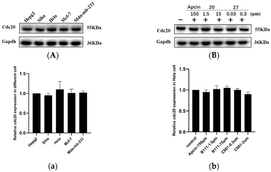 It is reported that Cdc20 protein is overexpressed in various cancer-cell lines. We selected four cells lines, including Mda-mb-231, Hepg2, Mcf-7, and Hela, to investigate the Cdc20 levels and detect the expression of Cdc20 (Figure 1). The results show that the level of Cdc20 protein in Hela cells was relatively high, and was selected as the cell line for further experiments. Similarly, neither compound 20 nor compound 27 had any effect on the level of Cdc20 protein in Hela cells, as shown in Figure 4, indicating that the compounds did not act by regulating the translational and post-translational modification of Cdc20, consistent with the mechanism of action of a Cdc20-specific inhibitor.