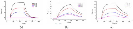 Surface plasmon resonance (SPR) assay provides information on the affinity and kinetics of molecular interactions, and the affinity value (Kd) associated with the interaction may be used to investigate the binding efficiency. The results of the SPR experiment are shown in Table 4 and Figure 2. Compounds 20 and 27 exhibited higher binding ability to Cdc20 protein than compounds 7d and 9f.