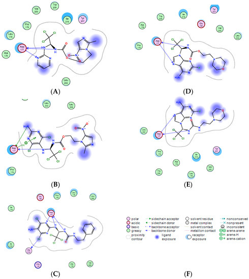 Predicted ligand interactions for (A) Apcin, (B) compound 7d, (C) compound 20, (D) compound 9f, (E) compound 27 bound to the Cdc20 crystal structure (PDB ID: 4n14). (F) This figure is an annotated illustration of the above figures. The binding ability of compounds B, C, D, and E with Cdc20 protein was evaluated by affinity values, and the results are as follows: S = −7.1530 (B), S = −6.6634 (C), S = −6.5298 (D), S = −6.7957 (E).