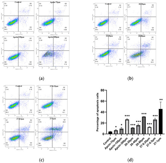 Apoptotic rates were increased in a concentration-dependent way in Hela cells treated with Apcin, compound 20, and compound 27 for 24 h. Compound 20 at 80 μM and compound 27 at 1 μM showed more potency than Apcin at 300 μM. The results are consistent with the trend of cell proliferation-inhibition experiments and Western blot experiments, indicating that the inhibitory effect of the compound on the proliferation of Hela was probably related to its apoptosis-inducing effect.