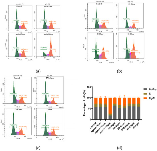 The Hela cells were seeded in a 6-well plate (2 × 105–3 × 105 cells/well), the 6-well plate was incubated at 37 °C with 5% CO2 in a humidified atmosphere, and the cells were grown in a monolayer. Then, the preset drug concentration was added and incubated for 24 h. Cells were collected by centrifugation and were fixed overnight with pre-cooled ethanol (70%) and washed twice with buffer, propidium-iodide staining solution was added (0.5 mL/well), and they were incubated at 37 °C for 30 min in the dark for flow detection.