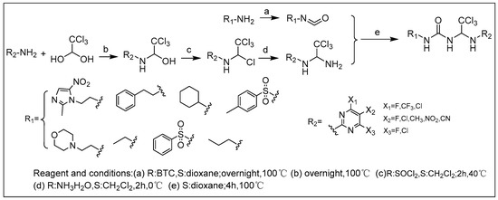 We synthesized 30 compounds (Table 1) following two schemes. In Scheme 1, the starting material of R1-NH2 was reacted with p-nitrophenyl chloroformate to obtain an intermediate, which was directly ammonolyzed without any further treatment to obtain ureido compound. Ureido compound was condensed with trichloroacetaldehyde hydrate and then chlorinated to obtain an intermediate, which was finally subjected to nucleophilic substitution with R2-NH2 to obtain the target products. In Scheme 2, the isocyanate method for generating the urea group R3-NH2 was first reacted with hydrated trichloroacetaldehyde, and then chlorination was carried out and an aminolysis intermediate was obtained. Finally, the target product was obtained by reacting isocyanate with the aminolysis intermediate.