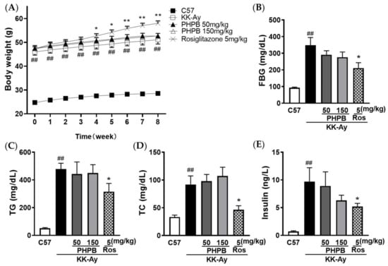 Effects of PHPB on body weight and metabolic features in mice. KK-Ay mice were treated with PHPB (50 or 150 mg/kg) or rosiglitazone (5 mg/kg) for two months by oral gavage. (A) Body weight, (B) Fasting blood glucose (FBG), (C) Plasma triglycerides (TG), (D) Plasma total cholesterol (TC), and (E) Plasma insulin. Values are represented as mean ± SEM. n = 10 for C57 group, n = 19 for KK-Ay group, n = 17 for PHPB 50 mg/kg group, n = 17 for PHPB 100 mg/kg group, n = 16 for rosiglitazone group. ## p < 0.01 versus C57 group; * p < 0.05, ** p < 0.01 versus KK-Ay group.