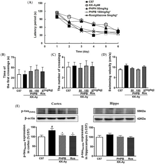 PHPB attenuated cognitive impairment in type 2 diabetic KK-Ay mice. KK-Ay mice were treated with PHPB (50 mg/kg or 150 mg/kg or rosiglitazone (Ros, 5 mg/kg) for two months by oral gavage. The performance of the Morris water maze was tested among all groups. (A) Spatial learning performance was analyzed by escape latency for mice to locate the hidden platform during the 6-days acquisition training. In the probe trial test on the seventh day, (B) the first latency time and (C) the times of crossings over the original platform location, and (D) the swimming velocity were recorded to evaluate the spatial memory maintenance/movement ability, n = 10–19 for each group. Furthermore, (E) the expression of classical hallmarks of AD, p-Tau (S404) protein, was detected in the cortex and hippocampus by western blotting, n = 8 for each group. And then, quantitative analysis of the expression of the p-Tau protein is presented as fold change relative to C57 mice. The data are presented as means ± SEM. # p < 0.05, ## p < 0.01 versus C57 group; * p < 0.05 versus KK-Ay group.