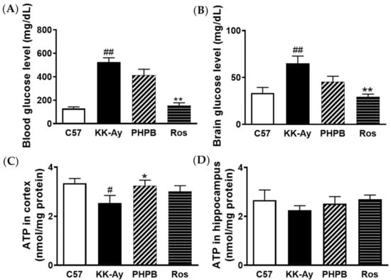 PHPB increased ATP production in the cortex of KK-Ay mice without any obvious differences in glucose levels. (A,B) Quantification of blood-glucose and cerebral-glucose using a micro-dialysis method in mice treated with PHPB (150 mg/kg) or rosiglitazone (Ros, 5 mg/kg) for two months, N = 7–10 for each group. (C,D) Detection of the ATP contents in the cortex and hippocampus by firefly luciferase method, n = 8 for each group. The data are presented as means ± SEM. # p < 0.05 versus C57 group. # p < 0.05, ## p < 0.01 versus C57 group; * p < 0.05, ** p < 0.01 versus KK-Ay group.