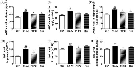 PHPB decreased the generation of AGEs or MG in the plasma and brain of KK-Ay mice. (A–C) Quantification of AGEs levels in plasma, cortex, and hippocampus by ELISA kits, and its levels were normalized to total protein concentration in the tissue samples of mice treated by PHPB (150 mg/kg) or rosiglitazone (Ros, 5 mg/kg) for two months, n = 8 for each group. (D–F) The MG contents (fold increase vs. that of C57 mice) of plasma, cortex, and hippocampus were measured by using the HPLC-UV method, n = 7–10 for each group. The data are presented as means ± SEM. # p < 0.05, ## p < 0.01 versus C57 group; * p < 0.05 versus KK-Ay group.