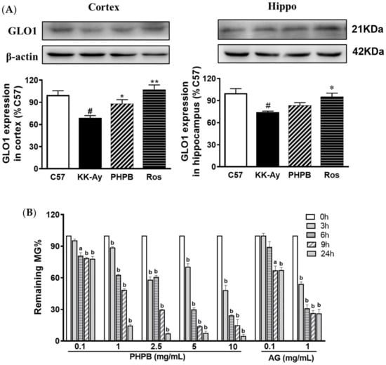 The previous studies showed that GLO1 could mediate the clearance of MG and subsequently inhibit the generation of AGEs, and protein expression of GLO1 was decreased in diabetic animals and subjects [,]. In the present study, the GLO1 protein was detected in the cortex and hippocampus by Western blotting. The results showed that the expression of GLO1 was obviously reduced by 31% (p < 0.05) and 26% (p < 0.05) in the cortex and hippocampus of KK-Ay mice, respectively, compared with that of C57BL/6J mice, the level of which was reversed in PHPB (increased by 28% in the cortex, p < 0.05) or rosiglitazone (increased by 56% in the cortex, p < 0.01; and 29% in the hippocampus, p < 0.05) treatment group (Figure 6A).