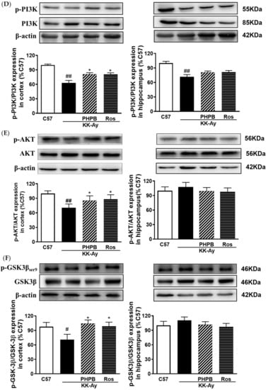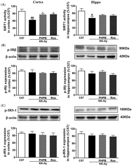 AGEs are known to contribute to insulin resistance by down-regulation of the SIRT1 activity, an NAD+-dependent deacetylase involved in multiple physiological functions [,]. The SIRT1 deacetylase activity was detected in the cortex and hippocampus of KK-Ay mice. In our study, the SIRT1 deacetylase activity was significantly decreased by 36% (p < 0.01) and 30% (p < 0.05) in the cortex and hippocampus of KK-Ay mice, respectively, whereas treatment with PHPB (150 mg/kg) or rosiglitazone could significantly reverse the reduction in the cortex by 36% (p < 0.05) and 35% (p < 0.05), respectively (Figure 7A). Furthermore, we found that the expressions of p-IRβ and p-IRS were no obvious differences in the brain among all animal groups (Figure 7B,C). However, the expressions of p-PI3K, p-Akt, and p-GSK3β in the brain were down-regulated in KK-Ay mice, but PHPB (150 mg/kg) or rosiglitazone treatments can restore the above variations in the cortex (p < 0.05) (Figure 7D–F). These results suggested that PHPB could improve insulin signaling in the brain by increasing SIRT1 deacetylase activity, which might contribute to improving cognitive impairment.