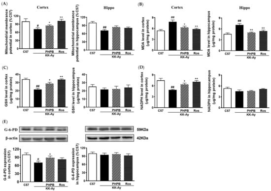 PHPB restored mitochondrial function and attenuated oxidative stress in KK-Ay mice. (A) Mitochondrial membrane potential (MMP, fold increase vs. that of C57 mice) was detected by JC-1 dye using commercial kits. (B) MDA levels and (C,D) the production of GSH or NADPH in the cortex or hippocampus were quantified using commercial assay kits. (E) Western blotting was used to detect the protein expressions of glucose-6-phosphate dehydrogenase (G-6-PD) in the cortex or hippocampus of mice treated with PHPB (150 mg/kg) or rosiglitazone (Ros, 5 mg/kg) for two months, and densitometric quantification of them. n = 8 for each group. The data are presented as means ± SEM. # p < 0.05, ## p < 0.01 versus C57 group; * p < 0.05, ** p < 0.01 versus KK-Ay group.