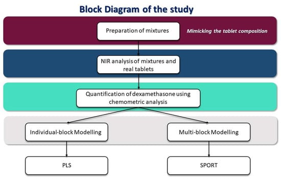 In light of this, the present work represents a feasibility study for the development of a NIR-based tool for the quantification of dexamethasone in mixtures of excipients such as starch and lactose. In order to achieve this goal, different methodologies based on the combination of NIR and chemometric regression methods have been tested. In particular, the NIR spectra were handled using two different strategies, one based on individual-block modeling, and one based on a multi-block approach. The first strategy is based on partial least squares (PLS) [,] while the second exploits the sequential preprocessing through the orthogonalization (SPORT) method []. These two approaches were chosen because they have numerous advantages and are often accurate [,,,], particularly in this context [,,].