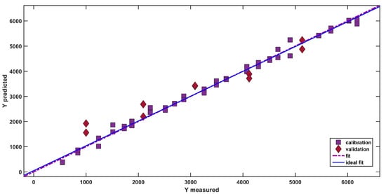 A graphical representation of the goodness of the fit is appreciable in Figure 3, where the predicted response (dexamethasone concentration) is plotted as a function of the measured response (i.e., the known concentration of the API in the mixtures). In the figure, calibration samples are represented as purple squares and test samples are depicted as red diamonds.
