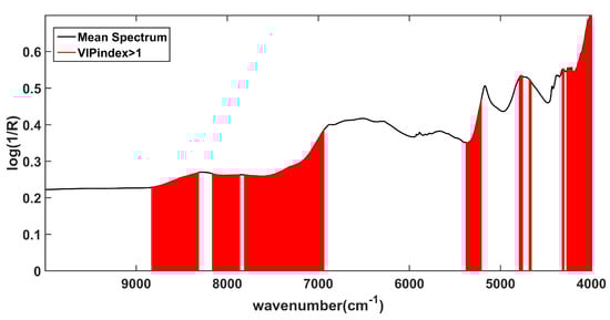Looking at Figure 4, where the average spectrum is shown as a black solid line and variables presenting a VIP index > 1 are highlighted in red, is possible to appreciate that the spectral regions contributing the most to the model are those ascribable to the second overtone and the combination of C–H stretching (8800 cm−1–8300 cm−1, 8100 cm−1–7800 cm−1), to the first overtone and the combination of O–H stretching (7800 cm−1–6900 cm−1, 4700 cm−1, 4600 cm−1) to the combination of the C=O and O-H stretching modes and of the second overtone of C=O stretching (5290 cm−1).