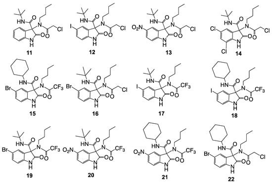 The data commented above, referring to the antiproliferative activity, allow us to draw some preliminary conclusions regarding the structure–activity relationships in these series. Thus, in series 1 (Ugi compounds), the maintenance of the chloroacetamide residue in position 3 seems to be important, as well as the presence of halogens (Br, I, Cl) in position 5 of isatin. With these characteristics, potent inhibition is achieved in at least one of the two cell lines studied, particularly for compound 22 (IC50 = 0.12 μM in Balb Mur cell line) and 12 (IC50: 1.3 μM in Balb and 8.3 μM in HeLa). Regarding the substituent from isocyanide (tert-butyl or cyclohexyl) from the Ugi reaction, both lyphophilic residues can provide good levels of antiproliferative activity, so this seems to be a less restrictive region.