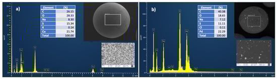 Catalytic resins loaded with copper or palladium species were analyzed by FESEM and EDX experiments. The distribution of both palladium and copper on the 3D-printed spherical bead surfaces were experimentally confirmed. Nanoparticles were found both within the resin and on the surface. The EDX analysis of the samples showed that the loading levels of both species were similar, 21.7% [IRA-Cu(0)] and 22.29% [IRA-Pd(0)]. As can be seen in Figure 1, the dispersion of the metal is more uniform along the surface of IRA-Cu(0) than in IRA-Pd(0).