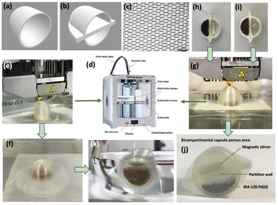(a) The 3D design of a unicompartmental capsule (see also Figure S1); (b) bicompartmental capsule; (c) polypropylene mesh (bar scale 1 mm); (d) 3D printer and components; (e,f) 3D printing of a unicompartmental capsule; (g) bicompartmental capsule; (h,i) parietal view of the 3D-printing process of Capsule@IRA-120-Cu(0) and Capsule@IRA-120-Pd(0); (j) view of the porous area (mesh) of Capsule@IRA-120-Pd(0). (k) View of Capsule@Amberlyst-15, in an isocyanide scavenging assay, in MeOH.