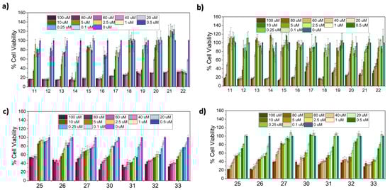 (a) Cell viability of Series 1 (compounds 11–22) in Balb and (b) HeLa cells. (c) Cell viability of Series 2 and 3 (compounds 25–33) in Balb and (d) HeLa cells.