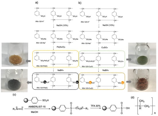 - Preparation of the catalytic systems to be compartmentalized (Scheme 1). Synthesis of efficient and robust resin–metal heterogeneous catalysts IRA-120-Cu and IRA-120-Pd (Section 2.1).