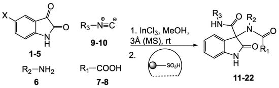 General conditions for Ugi: isatin derivative 1–5 (200 mg, 1 equiv), InCl3 (10 mol%), 150 mg of MS 3 Å and methanol (1 mL), n-butylamine (1.5 equiv), isocyanide (1.5 equiv), and carboxylic acid (1.5 equiv), rt.