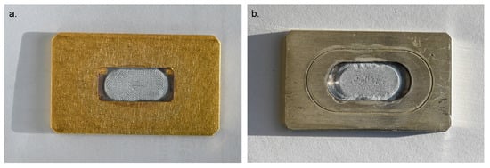 Thick, dense, silver [Zn]Zn targets were obtained after the electrodeposition, with masses between 115 to 160 representing area densities between 100 mg/cm2 and 140 mg/cm2 (i.a. target area ca. 116 mm2). These target thicknesses were used for the activation simulations verifying that satisfactory Cu yields could be reached. In some of these electrodeposited layers, some little holes were observed. As well, no major differences were found between electrodepositions from solutions containing fresh and recycled [Zn]ZnSO. In Figure 1, two typical Zn targets are shown, one corresponding to a fresh material electrodeposition on a gold backing and the other to a recovered material on a silver backing.