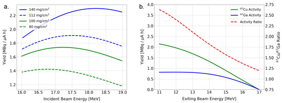 Results of the performed simulations. (a) Cu yield of the designed targets as a function of the energy of the incident beam. (b) Activity yields of Cu and Ga with their corresponding ratio.