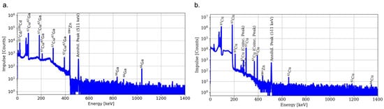 Gamma-ray spectra of raw target solution (a) and Cu product fraction (b).