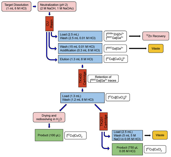 Radiochemical separation of the [Cu]CuCl consisted of a two-step solid-phase extraction. After dissolution of the target in 1 mL 6 HCl, the solution was neutralized by addition of 2 NaOH, volume estimated by knowing the Zn target mass and acid volume. Fine-tuning of the pH to reach a value of 2 was performed with 1 NaOAc. The resulting solution (2.0 to ) was loaded onto a preconditioned (3 × 8 HCl followed by 3 × HCl) CU resin column, similar to the work described by Thieme et al. [11]. After washing with 3 × HCl, the Cu elution was carried out with 8 HCl. Since in this fraction Ga activities accounting up to 2% of total activity were detected, the use of a second column to retain the radiogallium was forced. With this purpose, a preconditioned (3 × HCl followed by 3 × 8 HCl) TK400 cartridge was used. After loading the elution from the first column, the cartridge was washed with 8 HCl and these two fractions collected. This product solution was dried on a rotation evaporator and redissolved in water to obtain the product. Alternatively, the 8 HCl solution containing the [Cu][CuCl] could be loaded onto a preconditioned (3 × HCl followed by 3 × 8 HCl) TK201 cartridge. In this case, the column was washed with 5 NaCl in HCl like proposed by Svedjehed et al. [49] and the radiocopper eluted in 3 × HCl. Either way, a ready-to-label solution was achieved. A simplified scheme of the separation is showed in Figure 5.