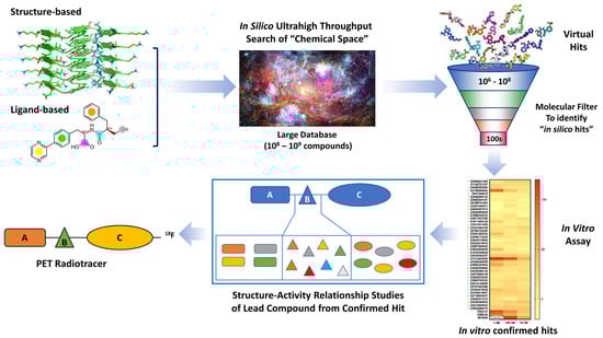 VS is the process of performing the computational equivalent of the experiments of a high-throughput screen to narrow the pool of candidate ligands before doing subsequent experiments in the laboratory [12,13]. When a new drug discovery program is started without any or with only very limited preliminary data, it is typically not possible to rationally design ligands. Therefore, VS is typically used as the first CADD method in a pipeline as it can rapidly test a large number of compounds computationally, reducing time and cost by limiting the number of compounds that must be synthesized or purchased. VS is usually performed using structure-based methods but can also be performed via ligand-based methods if there is at least one known hit [14]. Most often, VS is performed at an ultra-high-throughput scale (millions to billions of compounds) employing previously enumerated and purchasable chemical libraries or in-house VS libraries [15]. A standard VS workflow for the development of new radiotracers is described in Figure 1.