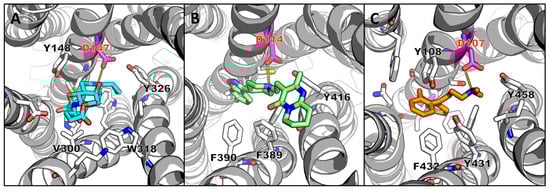Illustration of the key interactions between amino acid residues in the binding site and the crystallographic ligand. (A) µ-opioid receptor and a morphinan antagonist (PDB ID: 4DKL) [77], (B) dopamine D2 receptor and risperidone (PDB ID: 6CM4) [78], and (C) histamine H1 receptor and doxepin (PDB ID: 3RZE) [79].