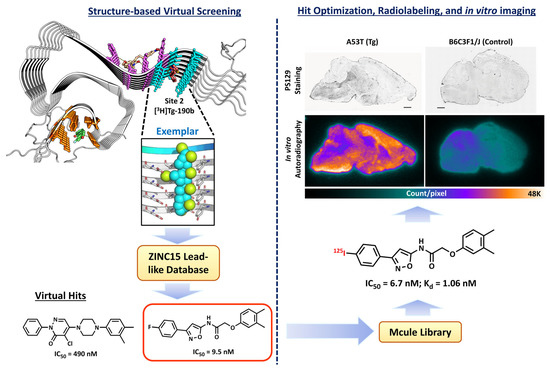 A similar but distinct pharmacophore strategy to the 3-D pharmacophore models described above is Gaussian sphere alignment to pseudomolecules [2,84,85]. This procedure is used when co-crystal structure information is not available and involves the generation of a pseudoligand that fills the volume of the putative binding site and has complementary chemical properties [86]. In this procedure, database molecules are aligned to the pseudoligand, and fitness is determined by how much the electron density of a database molecule overlaps with the pseudoligand, as well as the specific overlap of similar heteroatoms. Ferrie et al. [2] used this method to generate pseudoligands (termed “exemplars”) for Sites 2 and 9 of alpha-synuclein fibrils, which were putative binding sites for radioligands known to bind with high affinity to this target [1]. Two virtual hits having binding affinities (IC50-values) of 10 and 490 nM for alpha-synuclein fibrils on Site 2 were successfully identified using this method. A ligand-based similarity search was then conducted on the best virtual hits, and this effort identified a lead compound that had an IC50 of 3 nM in displacing the [3H]tg-190b Site 2 screening ligand. The lead compound was further radiolabeled with 125I for in vitro autoradiography and displayed high specific binding to alpha-synuclein pathology in A53T alpha-synuclein transgenic mouse brain and low binding in the control mouse brain (Figure 3). This is the only published report using the pseudoligand method in radiotracer development.