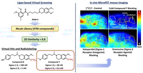Chemical fingerprinting methods identify possible hits by conducting a structural similarity score, which is calculated by comparing the 2-D and/or 3-D “fingerprints” of the screening compounds to those present in the reference compound(s) [90,91]. Two-dimensional fingerprints are vector representations of molecules and come in different varieties but are ultimately based on substructures. Morgan fingerprints are the most commonly used, but Daylight, MACCS, and Topological fingerprints are also commonly used 2-D representations that are easily computable with the Python library RDKIT [91]. Vector representations of molecules allow for easily computable quantitative measures of similarity. The most commonly used metric is called the Tanimoto similarity, which is a quantity bounded between 0 and 1 [92,93]. Three-dimensional fingerprints differ from 2-D fingerprints only in that the substructure search procedure is not limited to the 2-D representation of the molecule but uses a shell radius on a low-energy 3-D conformer of the molecule to produce the vector representation. Kim et al. used a selective compound, RHM-4, for sigma-2 receptors as the reference compound for 2-D fingerprint similarity screening and identified multiple virtual hits that had binding affinities in nanomolar range for the sigma-2 receptor [3] (Figure 4). The top two virtual hits had sub-nanomolar binding affinities for the sigma-2 receptor and 20- to 80-fold selectivity over sigma-1 receptors. The two lead compounds were radiolabeled with carbon-11, and in vivo microPET imaging studies demonstrated high specific binding to sigma-2 receptors in a mouse brain (Figure 4).