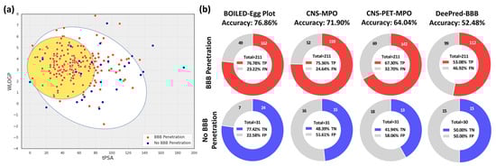 The brain or intestinal estimated permeation method (BOILED-Egg) provides a graphical model for BBB permeability by simply plotting the lipophilicity (WLogP) and topological polar surface area (tPSA) of compounds in a scatter plot [101]. Compounds located in the “yolk” of the BOILED-Egg plot are predicted to cross the BBB, and those located in the “egg white” are predicted to have gastrointestinal absorption. While the BOILED-Egg plot represents a simple and intuitive method for predicting BBB penetration, there are other ML-based approaches that have shown a strong ability to predict BBB penetration at the cost of interpretability. Kumar et al. demonstrated that a transfer learning approach employing a deep neural network, DeePred-BBB, was able to achieve 98% accuracy on a dataset of over 3000 tested compounds [102].