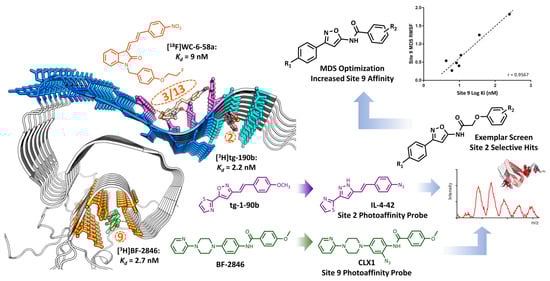 Three putative alpha-synuclein binding sites, Sites 2, 3/13, and 9, identified from the blind docking studies. Site 2 and Site 9 were confirmed via in vitro photo-cross-linking and mass spectrometry studies. [3H]tg-190b and IL-4-42 are the radioligand and photoaffinity probes for Site 2. [3H]BF-2846 and CLX1 are the radioligand and photoaffinity probes for Site 9. Site 2 and Site 9 probes were used to test in silico hits from the Exemplar screen and Site 9 optimization based on MDS.