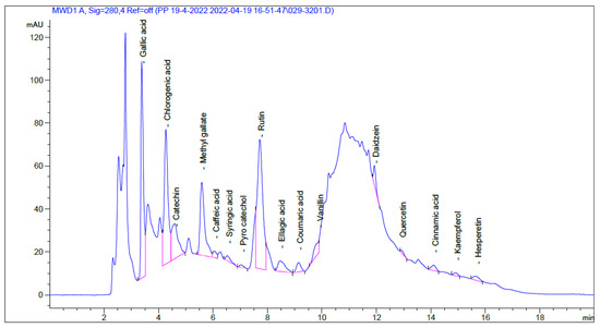 The chemical composition of SCRE was identified and quantified by utilizing HPLC. Figure 1 shows the HPLC chromatogram for the specified components in the SCRE. Ultimately, 16 components were confirmed by reference standards with a confidence level of 95%. These HPLC-identified compounds are listed in Table 1. The most abundant phenolic compounds were chlorogenic acid (90.85 μg/mL), gallic acid (51.56 μg/mL), ellagic acid (32.27 μg/mL), and methyl gallate (25.92 μg/mL). The major flavonoids were catechin (74.60 μg/mL) and rutin (61.23 μg/mL).