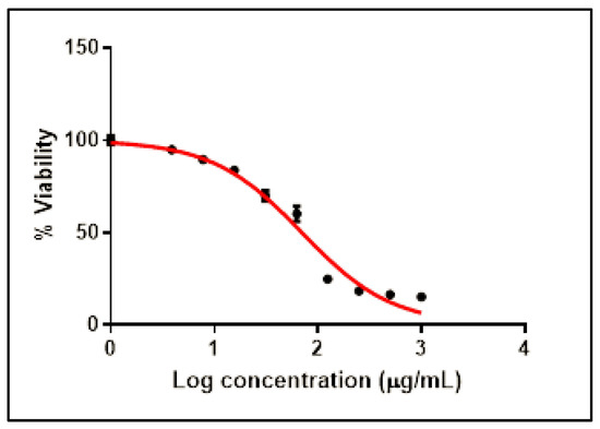 Cytotoxicity curve of SCRE (with CC50 of 70.36 ± 0.8 µg/mL). The results are exhibited as mean ± SD.