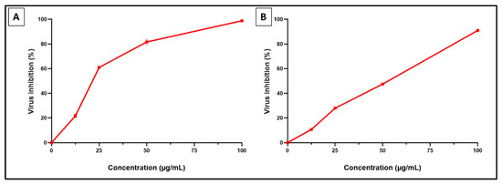 Antiviral activity of Saussurea costus roots on (A) low pathogenic human coronavirus (HCoV-229E) (with IC 50 of 23.21 ± 1.1 µg/mL) and (B) human influenza virus H1N1 (with IC50 of 47.6 ± 2.3 µg/mL). Results are shown as mean ± SD.