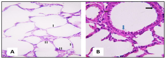 Section of a rat lung of the control (group I) showing the following features. (A) A normal lung architecture with thin interalveolar septa and patent alveolar sacs. A thin type I pneumocyte with flat nuclei (I) was noticed, and a small number of cuboidal type II pneumocytes with their large, rounded nuclei and vacuolated cytoplasm (II) were present at the angles of the interalveolar septa (H&E, ×400). (B) The bronchiole is lined by simple columnar epithelium (black arrow) and is surrounded by concentric layers of smooth muscle fibers (M). Club cell is observed in the lining of the bronchiole (blue arrow) (H&E, ×400).