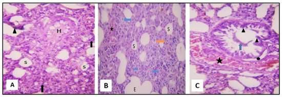 Section of a rat lung of (CP-treated) group II presenting the following features. (A) Thickened interalveolar septa with heavy mononuclear cellular infiltration (↑) and marked narrowing of the alveolar spaces (S). Alveolar epithelium is hardly distinguished. One regenerated alveolus lined by rounded type II pneumocytes and filled with homogenous exudate can be distinguished (H). The presence of hemosiderin-laden macrophages (▲) is noticed (H&E, ×400). (B) Thickened interalveolar septa with hyperplastic pneumocyte II (blue arrow), foamy macrophage (orange arrow), marked narrowing of the alveolar spaces (S), and over-dilatation of others (E). Congested blood vessel (⁕) is noticed (H&E, ×400). (C) The bronchiole with epithelial cells has strongly stained nuclei (▲). The bronchiolar lumen is full of exfoliated epithelial cells (blue arrow) and is marked by detachment of bronchiolar epithelium from underlying lamina propria. Congested blood vessels (⁕) are noticed with extravasated blood cells in the lung interstitium (H&E, ×400).